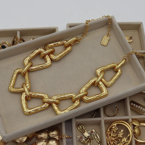 This chunky choker of textured trapezoid links is the ultimate statement piece. Fresh and fun, it is also lightweight. Need something powerful for the next Thunderdome? This contemporary number really lets them know you’re coming. Closes with a lobster clasp and features a two-inch extender that allows you to wear this number either as a trendy choker or as a classy necklace resting by your collarbone.