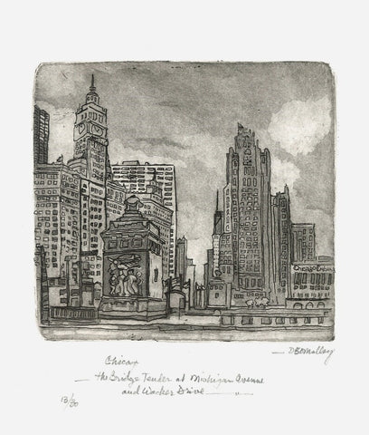 Original etchings of The Bridge Tender at Michigan and Wacker Drive and A Chicago Snowfall.