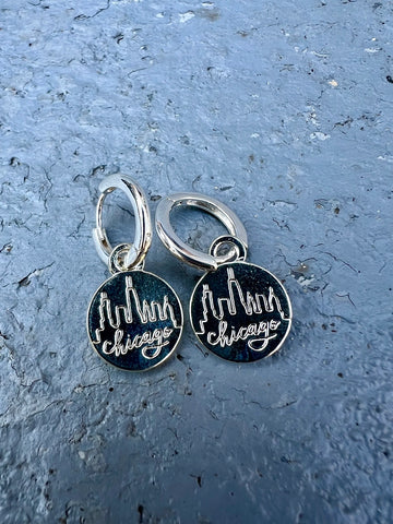 Hand-drawn Chicago skyline design on 0.5'' circle pendants hang from huggee-style earrings, available in silver or gold.
